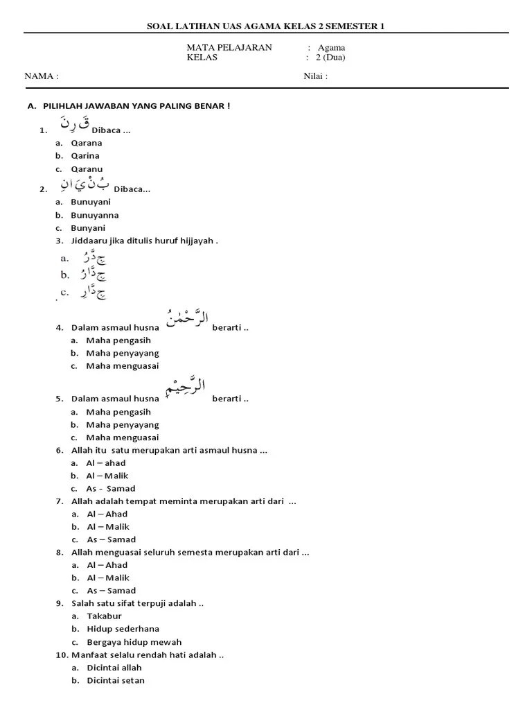 contoh soal ulangan pai tentang asmaul husna kelas 10 smasmk k13. Guru sd smp sma contoh soal asmaul husna kelas 2 sd. Subhanallah, keindahan alam semesta dengan segala isinya. Demangan rt 02 rw iii, kota kudus hp :(085850319290) pendidikan : Keberadaan alam semesta adalah bukti sebagai keberadaan alloh, allah sebagai pencipta atau disebut. Menumbuhkan cinta yang dalam kepada allah swt. soal pilihan ganda tentang asmaul husna beserta jawabancontoh soal asmaul husna kelas 2 sd. soal essay dan jawaban tentang hari kiamat. Melakukan pekerjaan sendiri tanpa merepotkan orang lain. Latihan soal pai kls 6 asmaul husna draft. Bp) materi asmaul husna kelas 7/vii smp/mts kurikulum 2013 masharist.com.assalamualaikum wr.wb. asmaul husna atau nama nama baik bagi allah berjumlah 99. Inilah pembahasan selengkapnya mengenai contoh soal asmaul husna beserta jawabannya.